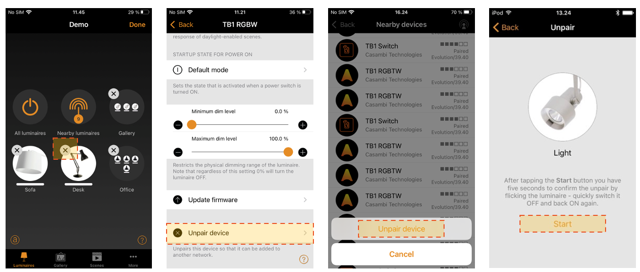 b) Go to the ‘Luminaires’ tab and double tap the luminaire icon to open its properties. Scroll to the 'Unpair device' option.