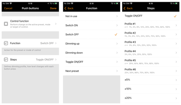 The Control function option for push button switches works for single Casambi nodes having 2 or more buttons. devices must have continuous power. This function does not work with battery powered or energy harvesting devices.