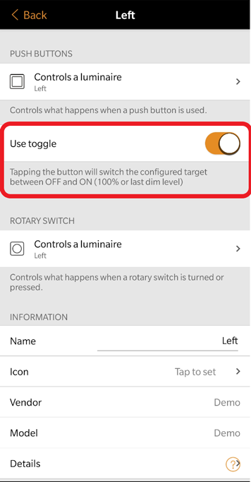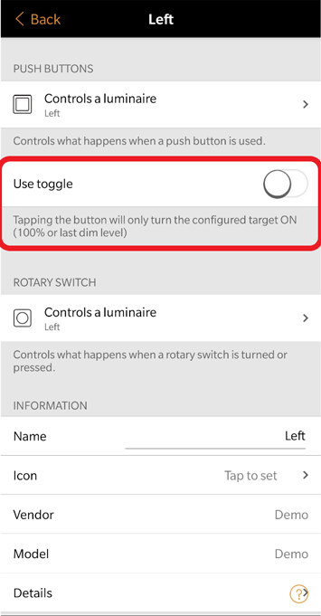 - Having "Use toggle" disabled, will only turn the selected Scene/Luminaire etc. ON (send ON commands when the button is pressed).