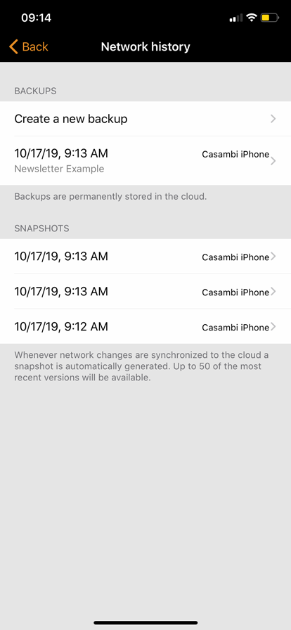 There is a new ‘Network History’ feature introduced in the Casambi App version 3.1. The feature includes backups as well as snapshots of the network. Both backups as well as snapshots are stored in the cloud. A backup is a manually saved backup of the network. A snapshot is automatically generated whenever network changes are syncronized. Up to 50 of the most recent versions will be available.
